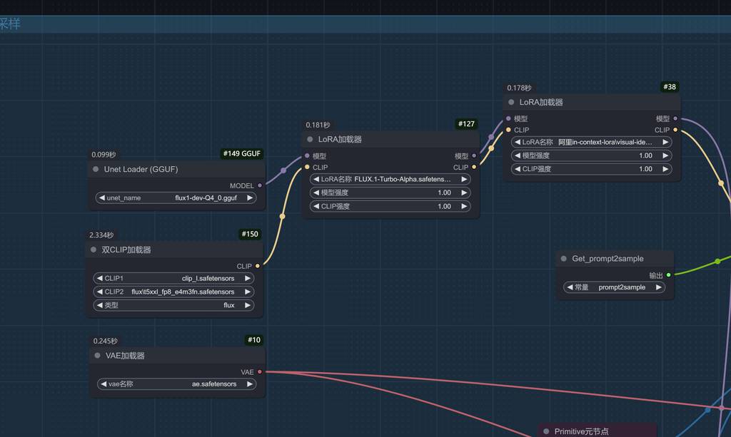 采样流程就很简单了,flux-gguf工作流,串联ic lora,我这里还串联了一个8步加速模型,提高抽卡速度。