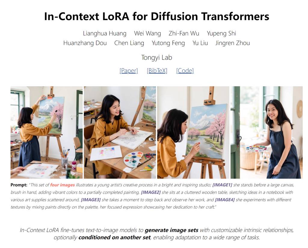 虽然今天演示的ComfyUI工作流,但是其核心技术,是来自阿里巴巴前不久开源的In-Context LoRA (IC-LoRA)技术方案,项目地址:https://ali-vilab.github.io/In-Context-LoRA-Page。