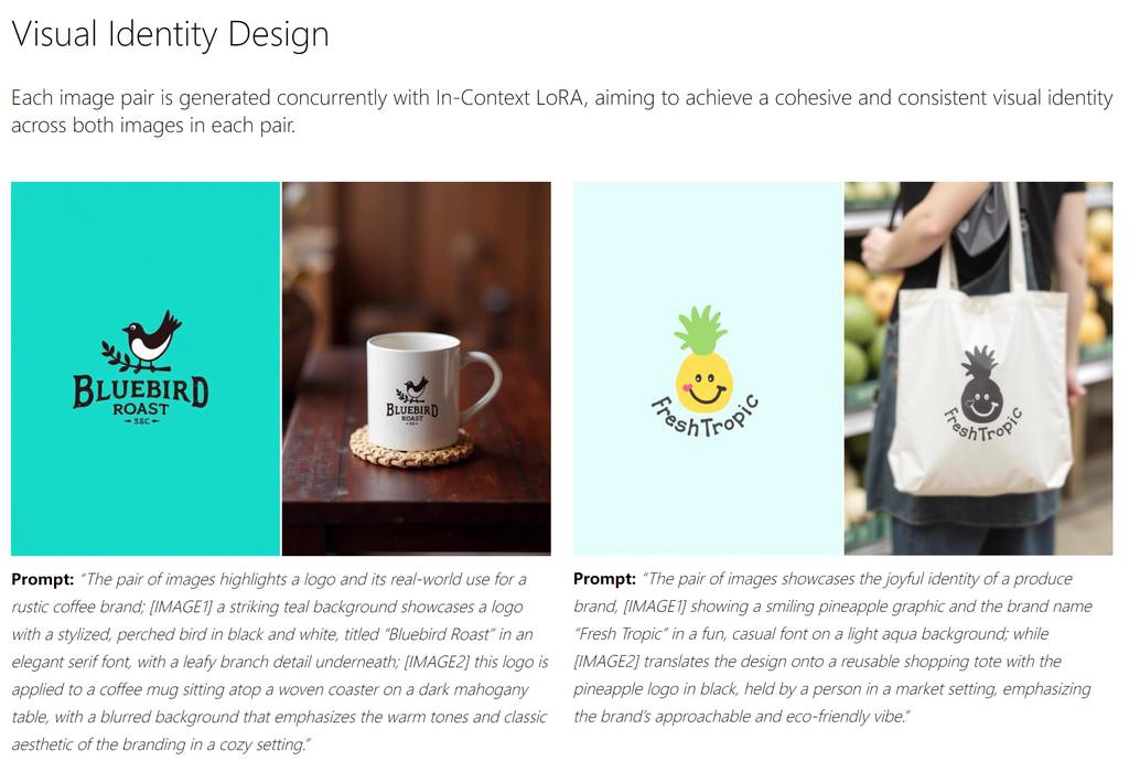 Visual Identity DesignLoRA的提示语中,第一段是描述整个场景,第二段_[IMAGE1]生成图案元素,第三段[IMAGE2]生成mockup。 所以不难看出,只要flux获得参考(当然,这个是需要训练LoRA让FLUX知道这个规则)。那么对照左右两侧的潜空间,就可以生成一致性很高的图。