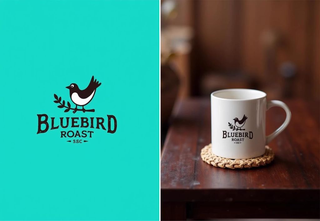 _The pair of images highlights a logo and its real-world use for a rustic coffee brand; [IMAGE1] a striking teal background showcases a logo with a stylized, perched bird in black and white, titled “Bluebird Roast” in an elegant serif font, with a leafy branch detail underneath; [IMAGE2] this logo is applied to a coffee mug sitting atop a woven coaster on a dark mahogany table, with a blurred background that emphasizes the warm tones and classic aesthetic of the branding in a cozy setting._