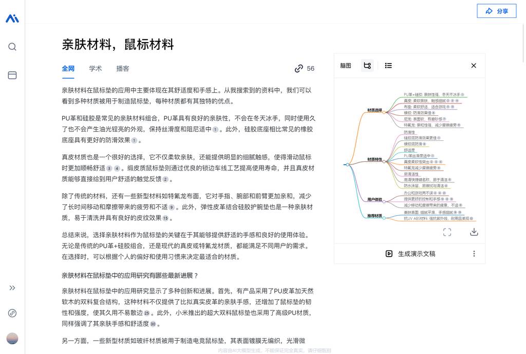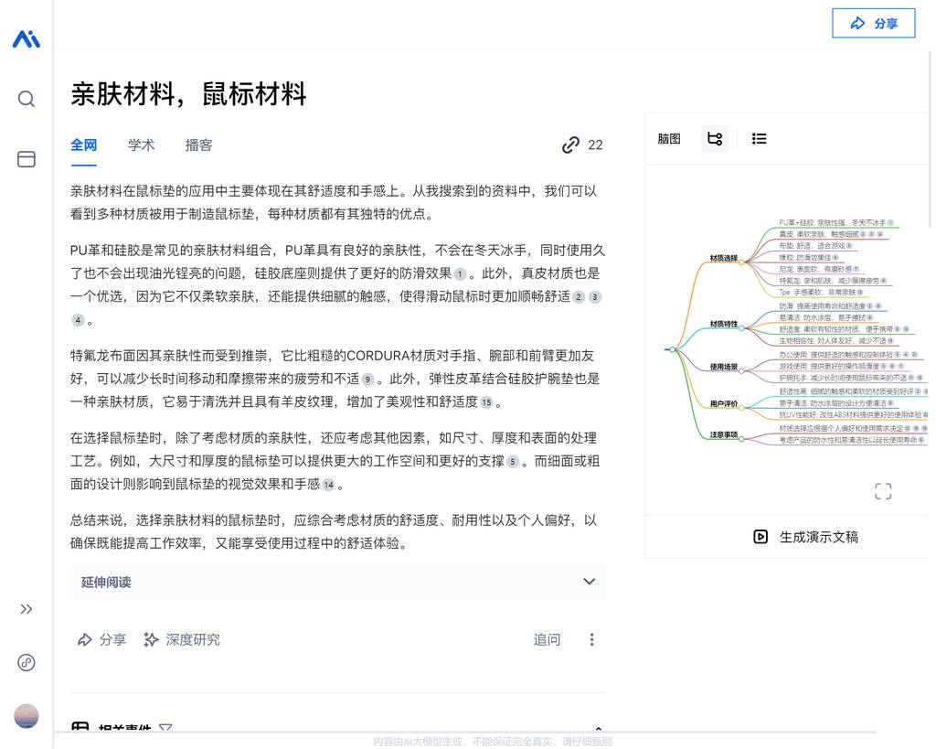 秘塔搜索会对关键字进行全网搜索,且通过大语言整理、归纳呈现给用户。