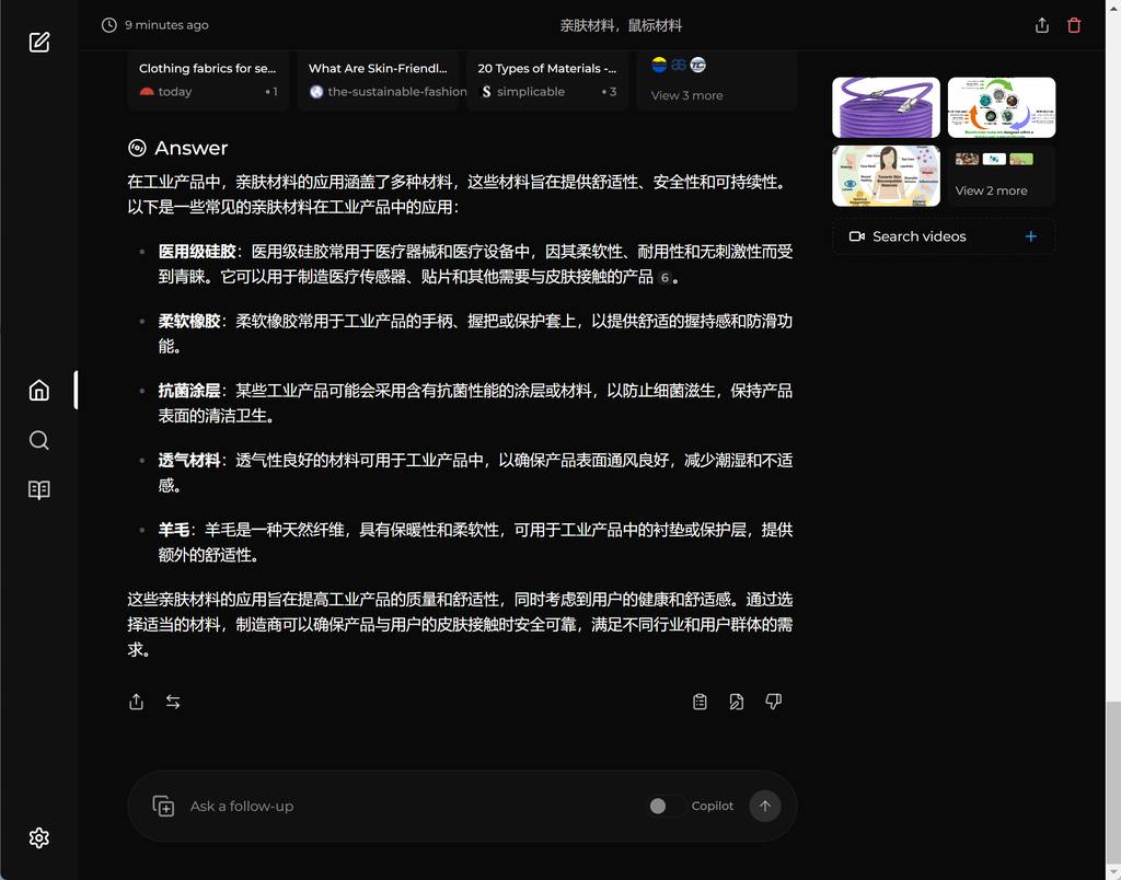 进一步查询亲肤材料的应用,我们得到一些文字和图片结果,甚至还有视频。