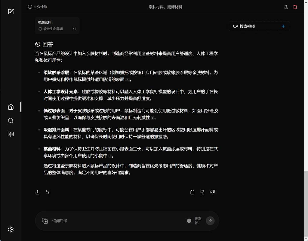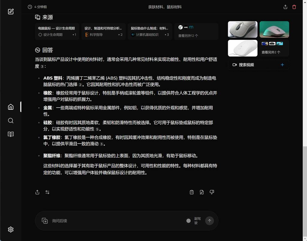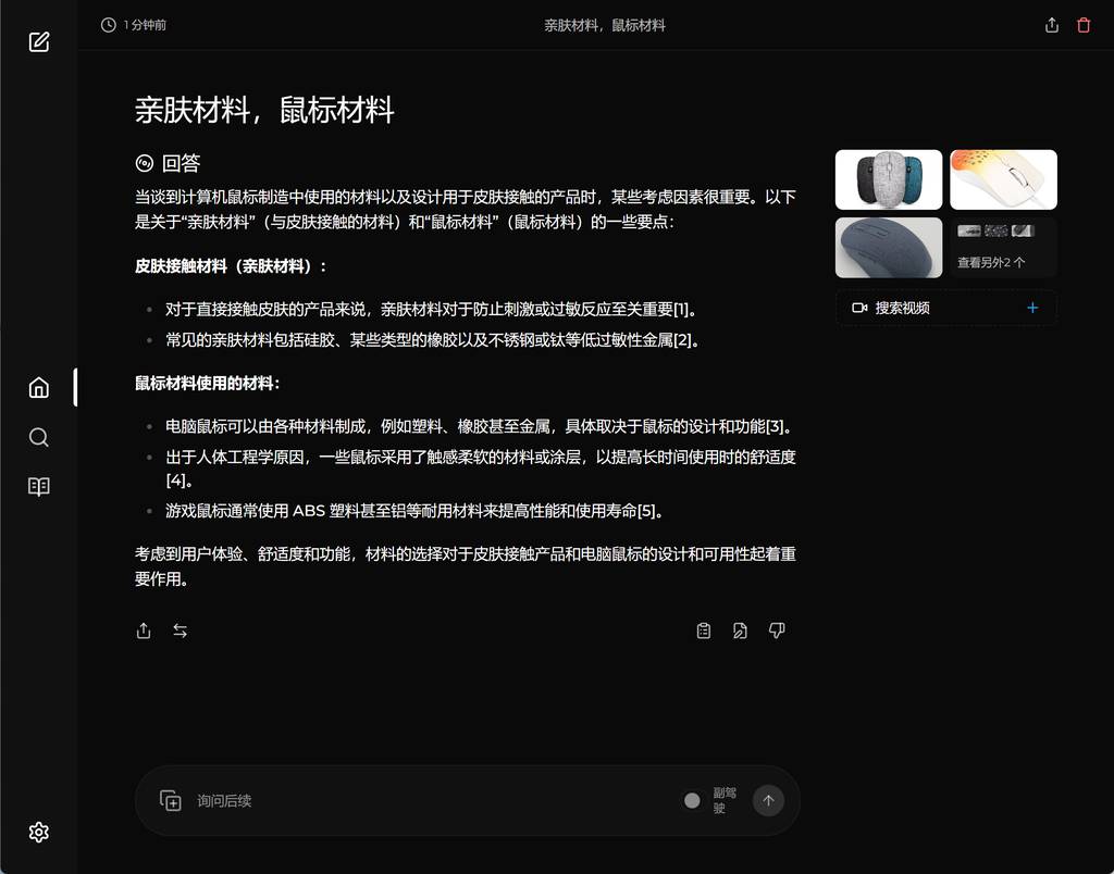 秘塔搜索对文字的整理和呈现,以及结构化整理知识,已经很好了,但是有个问题,就是没办法看到搜索的图片,作为CMF的检索,视觉效果尤为重要。接下来我们使用类perlexity的检索工具。