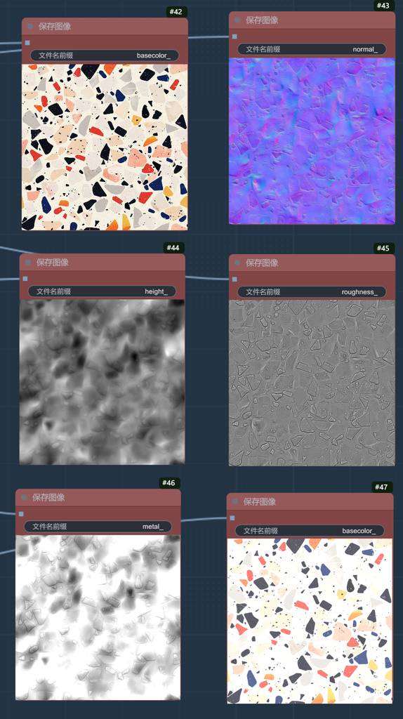 当然,最终的输出,不一定都要用,例如这里的水磨石,除了颜色和粗糙度、法线外,金属和高度贴图其实不需要。