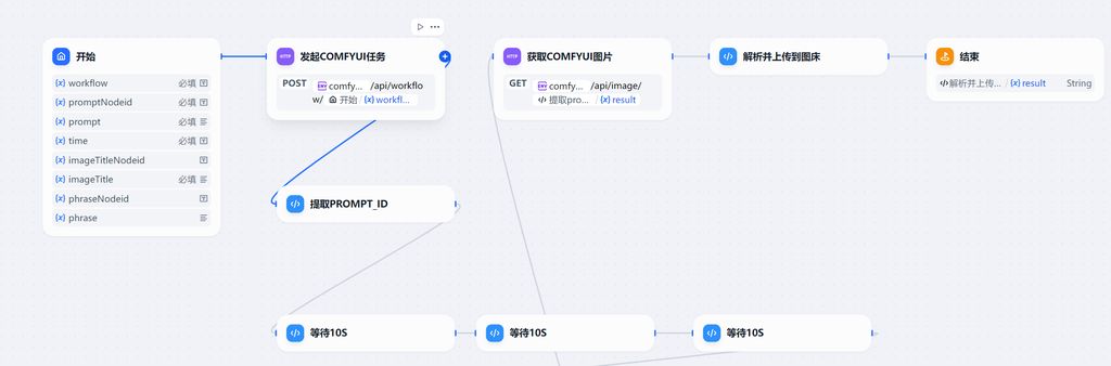 这里有个难点,如果有开发大佬看到也帮忙看看:http请求存在异步问题,所以发起任务后,直接请求image是不行的,我这里做了个骚操作🥱,串联了一堆代码执行节点,用于设置等待时间。