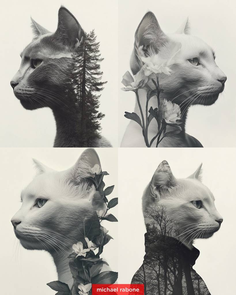 • cat and (subject) double exposure —ar 4:5 —style raw —sref 449454483 —sw 100 —stylize 300