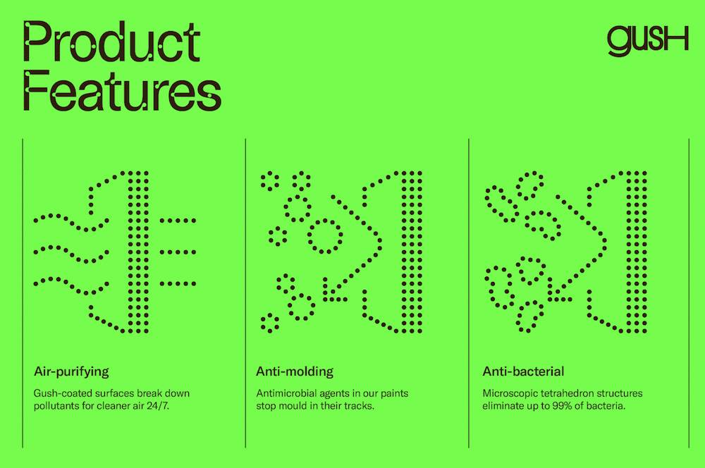 Gush源于新加坡,在那里借助科学家的帮助开发出一种能够清洁空气中来自清洁剂、家具或电子产品释放的挥发性气体的颜料配方。