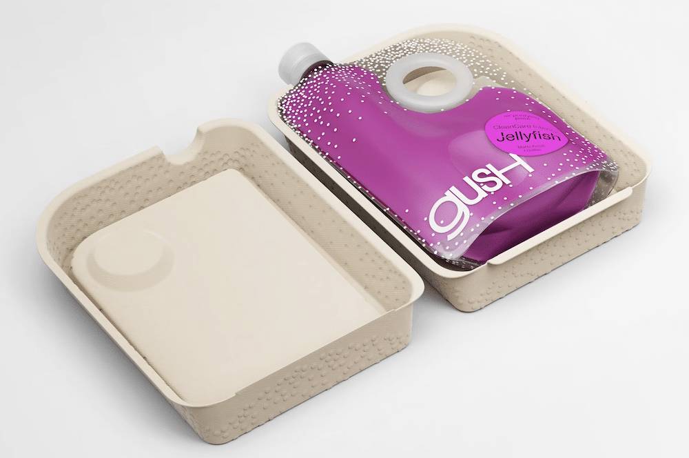 圆形提手呼应了Gush图标,纸浆碗上则印有与企业形象相关的圆圈图案。