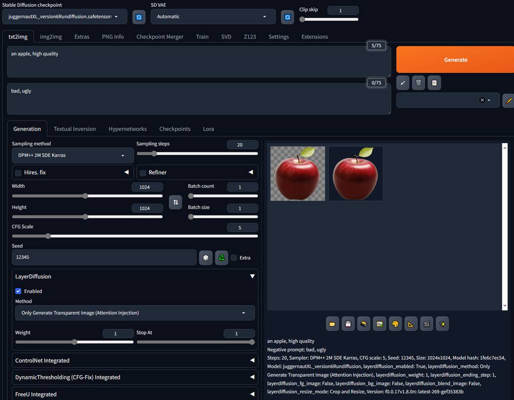 Forge 是 WebUI 的一个分支,其操作逻辑和交互与 Web UI 完全相同,只是在底层进行了一些修改以提高生成速度。插件在运行时会自动下载所需模型。LayerDiffusion 项目现在已经成功整合到 Forge 的扩展中,这一功能可以直接生成具有透明背景的图片。