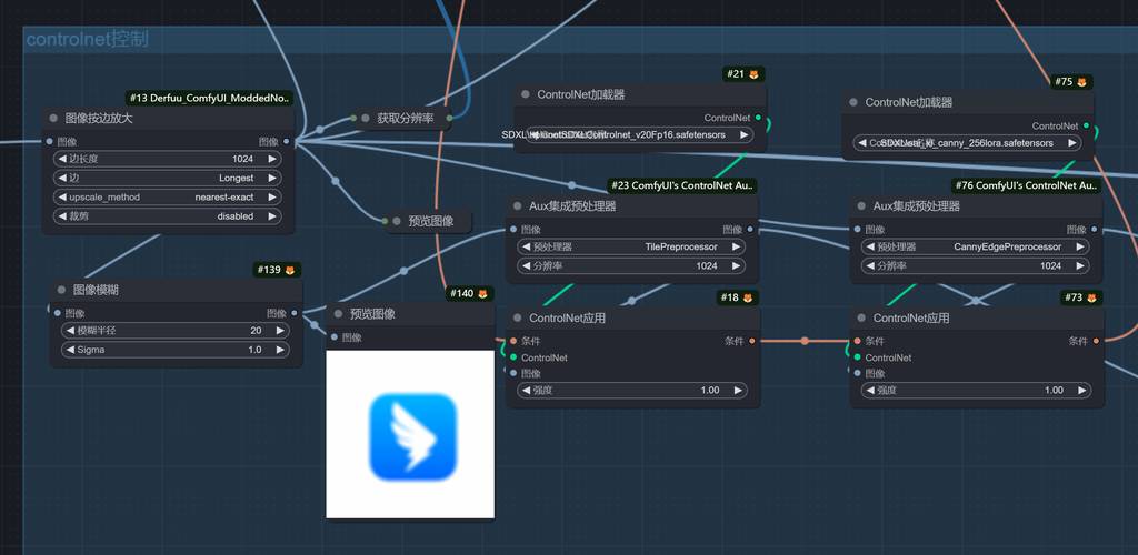 在第一次采样前,先进行cn的控制。这里为了获得图标软边缘效果,对图像进行了模糊处理,更符合绒毛效果的生成。 cn上,先用tile模型处理,然后通过canny控制形体。