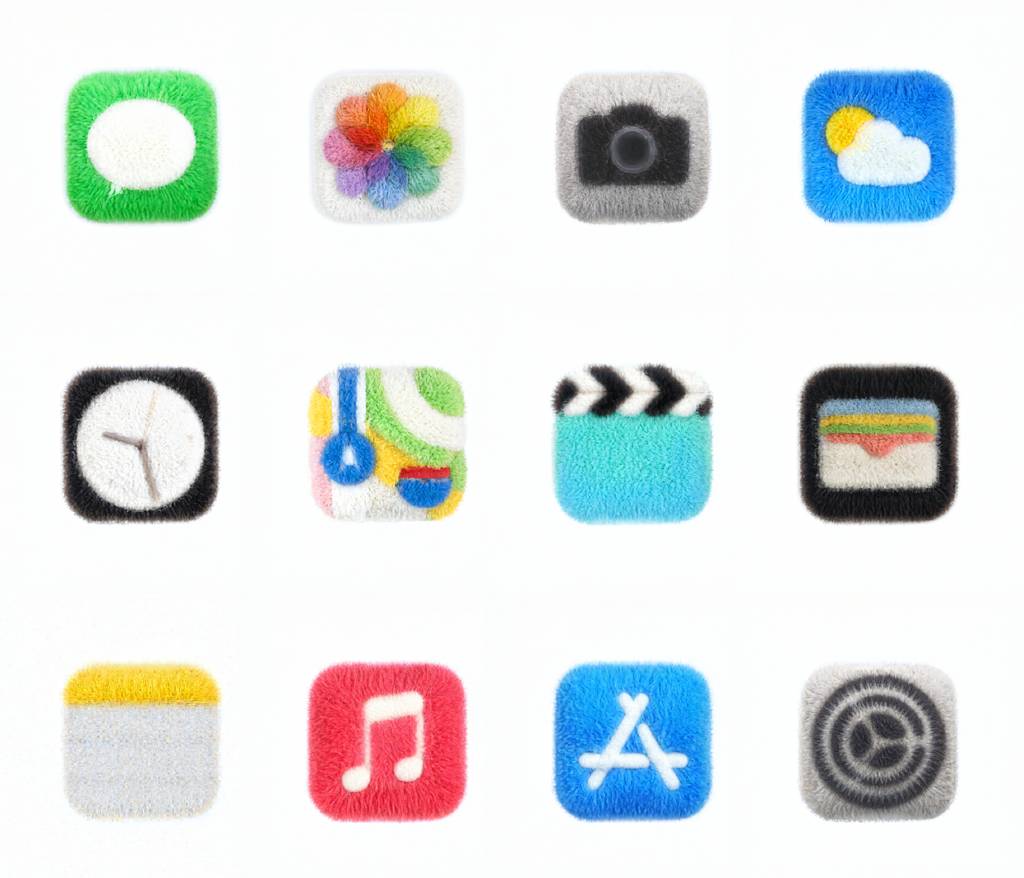 虽然如果从实用性角度,这种设计不太适合作为真正意义上的图标,因为图标的意义在于直观明了的传达信息,而这种设计过于花哨,不利于图标的识别。 但从另外的角度来说,这组图标的设计非常独特,用毛茸茸的材料制成的,给人以温暖的质感,有点击欲望,适合现在年轻人流行的“治愈文化”。 如果要达到一个非常好的质感,我猜设计师应该是使用C4D或者Blnder等3D软件制作的,这类需要花很多时间和心血制作。 现在AIGC的普及,带来更快捷的方式去制作这类图标风格。 设计小站也尝试跟风做了一个工作流,通过更换LoRA是可以达到更细腻的效果的。