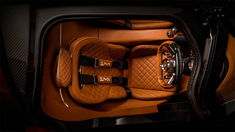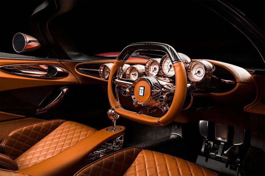 内饰将奢华提升到了另一个层次。它的设计看起来像是珠宝收藏中的一件作品,采用高端材料和令人惊叹的工艺。桶形座椅由碳纤维和奶油色皮革混合制成,而仪表板则配备了六个定制的铜色仪表。甚至换挡机构也是一件艺术品,裸露并经过精加工,以匹配汽车的其余细节。