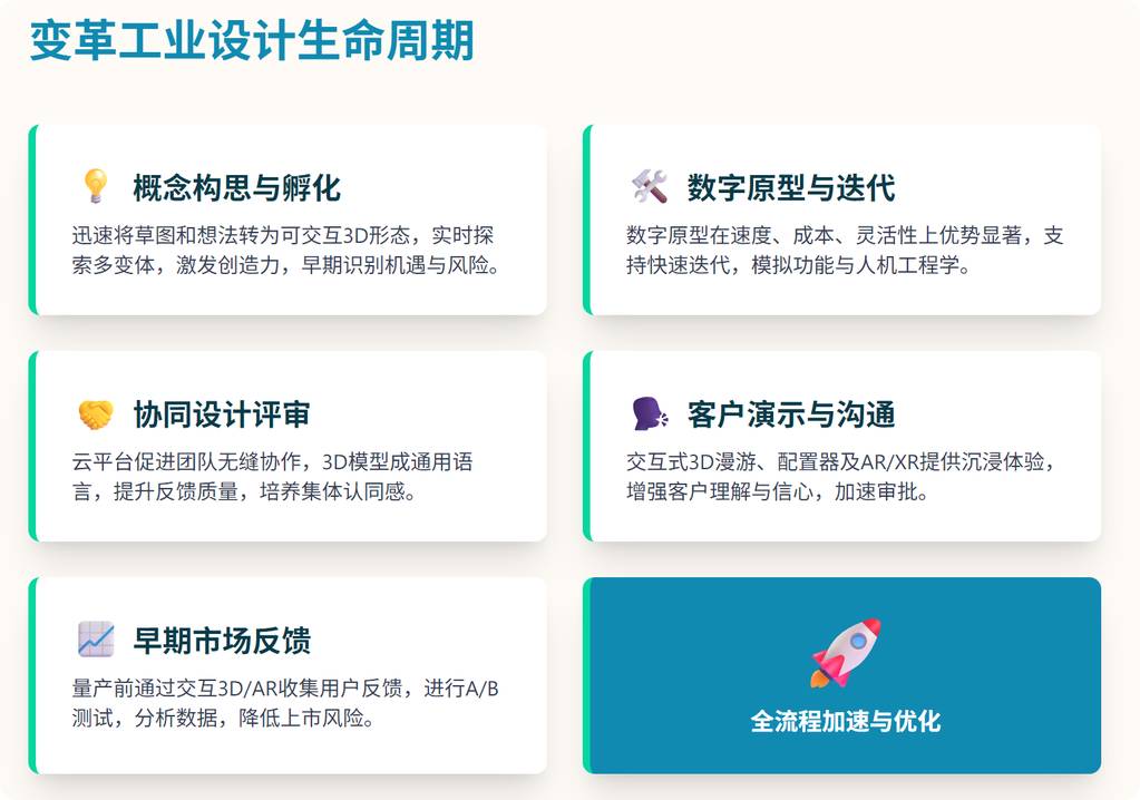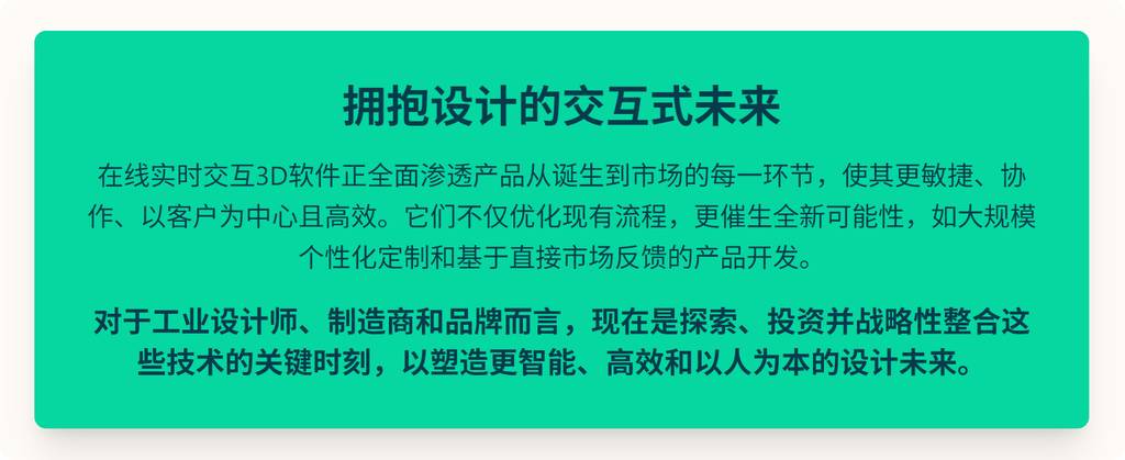 对于工业设计师、制造商和品牌而言,现在是探索、投资并战略性地整合这些交互式3D技术的关键时刻。只有积极拥抱这场交互革命,才能在不断演变的产品创新与商业竞争格局中保持领先,并最终塑造一个更加智能、高效和以人为本的设计未来。