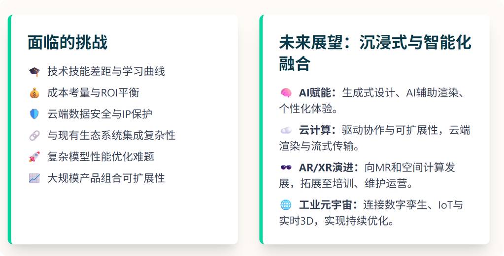 企业在引入这些新技术时,需要考虑软件采购、员工培训以及潜在的内容创作等初期投入 。然而,这些投入应与长期来看效率提升、销售增长以及原型制作成本降低所带来的投资回报相权衡 。