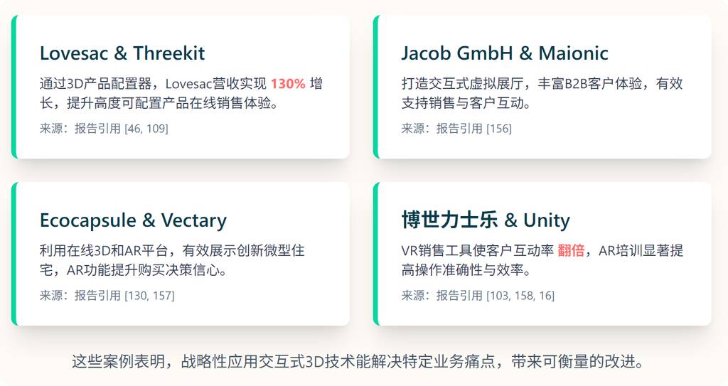 这些成功案例的共同点在于,它们都将交互式3D技术战略性地应用于解决特定的业务痛点,而非盲目追求技术本身。无论是Lovesac需要在线销售高度可配置的家具,Jacob GmbH希望更好地解释其工业部件,还是博世力士乐旨在有效展示大型机械,交互式3D技术都直接克服了传统方法的局限性,从而在销售额、客户参与度或运营效率方面取得了可衡量的改进。