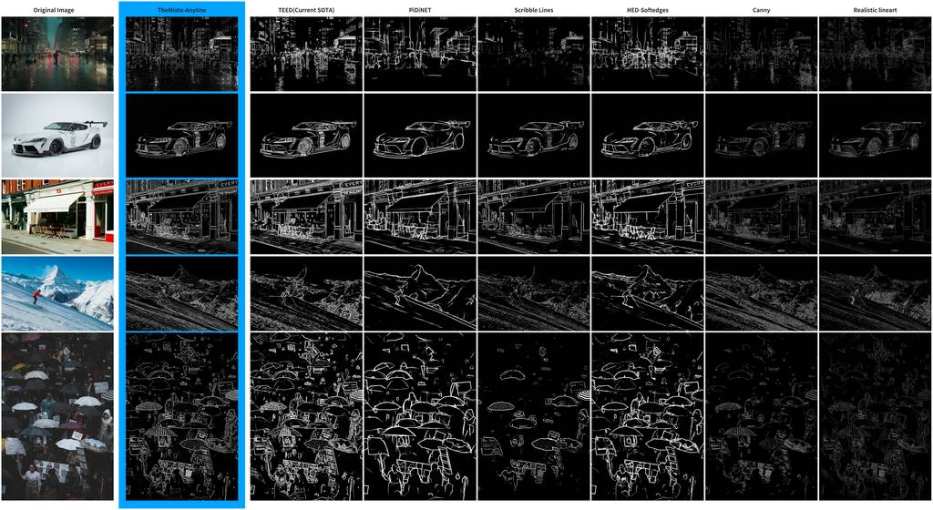Anyline 使用的模型和算法基于 “Tiny and Efficient Model for the Edge Detection Generalization (TEED)” 论文(arXiv:2308.06468)中的创新努力。TEED 预设在 ComfyUI 中也源自这项工作,标志着它是一个强大的视觉算法(TEED 目前是最先进的)。更多细节,请参考论文。