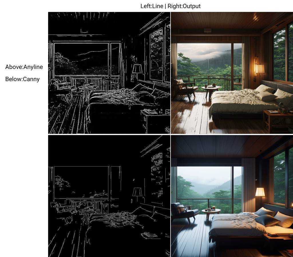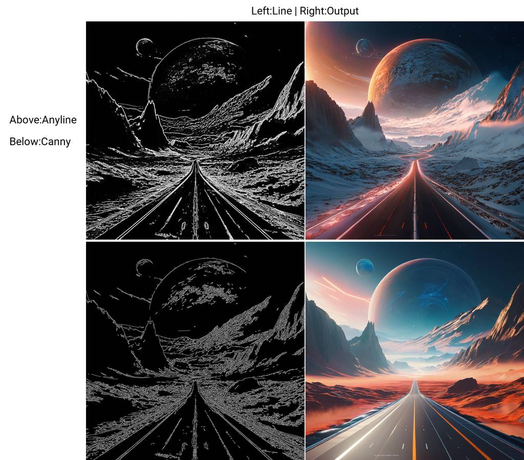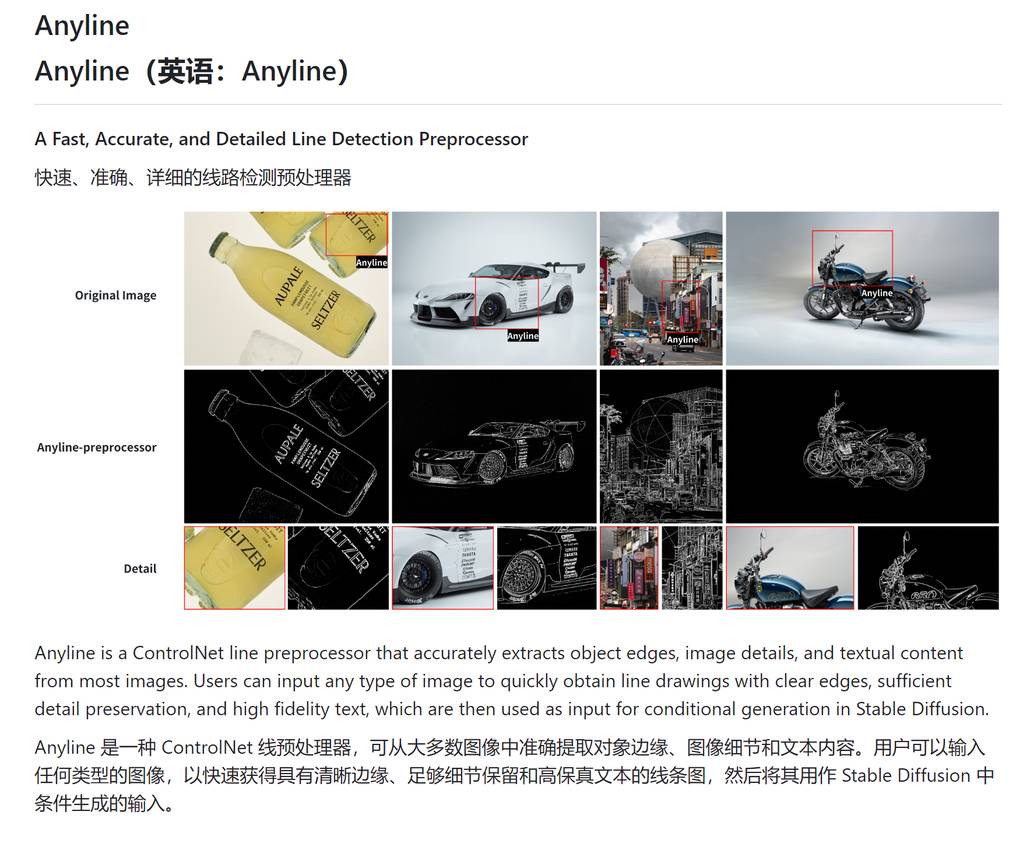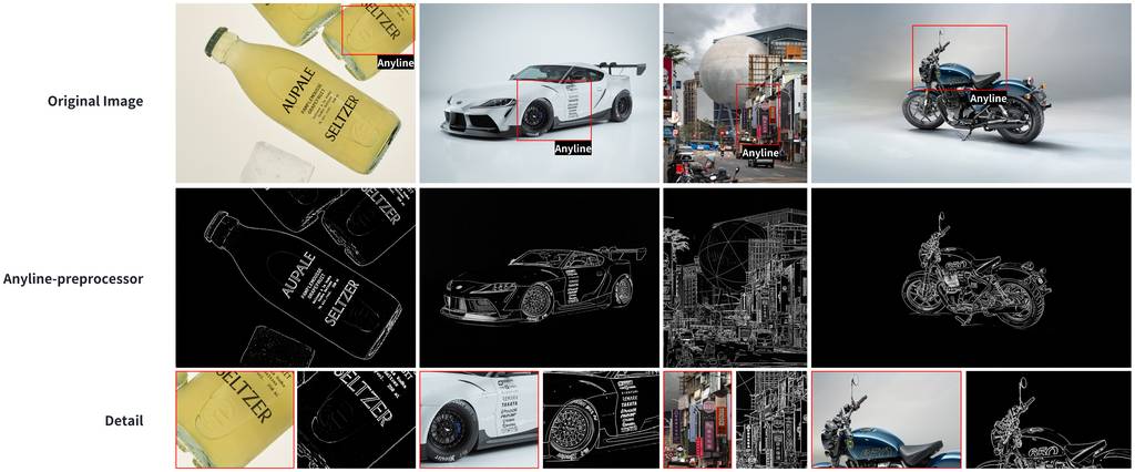 Anyline 是一个 ControlNet 线条预处理器,能够从大多数图像中准确地提取对象边缘、图像细节和文本内容。用户可以输入任何类型的图像,快速获得线条清晰、细节保留充分、文字高保真的线稿,这些线稿随后用作 Stable Diffusion 中的条件生成输入。