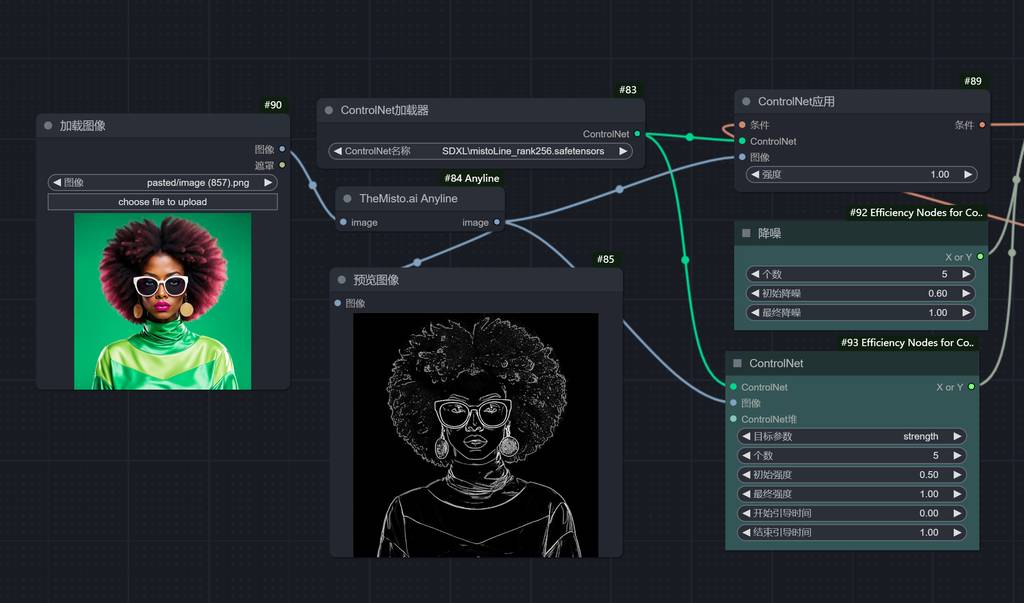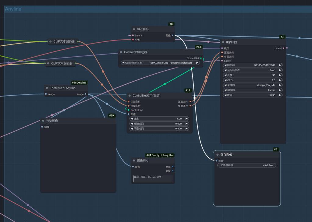 Anyline 与 Mistoline ControlNet 模型结合,形成了一个完整的 SDXL 工作流程,最大限度地实现了精确控制并利用了 SDXL 模型的生成能力。Anyline 也可以在 SD1.5 工作流程中与 SD1.5 的 ControlNet 一起使用,尽管它在 SDXL 工作流程中的 Anyline+MistoLine 设置中通常表现更好。