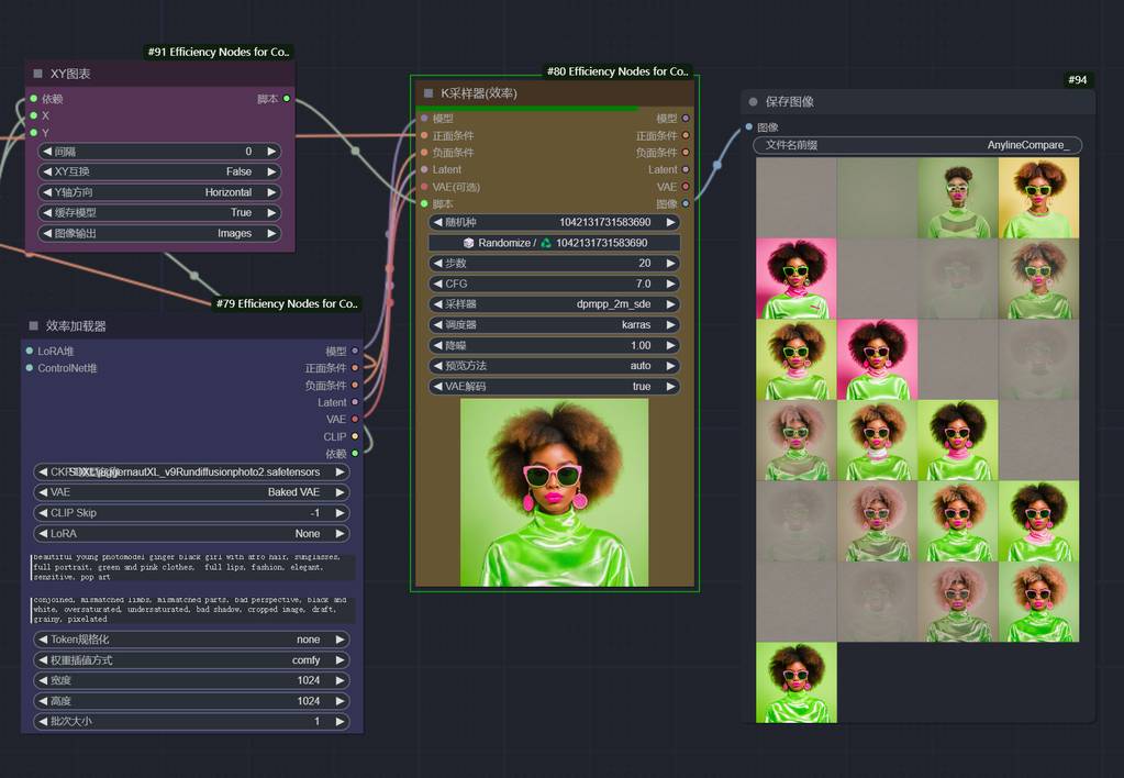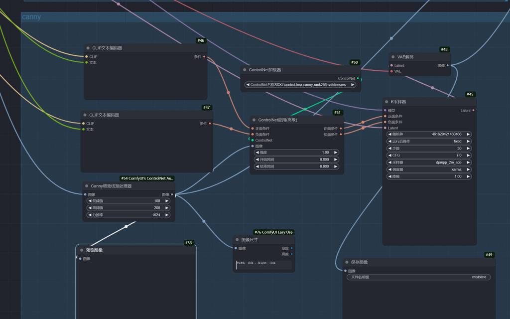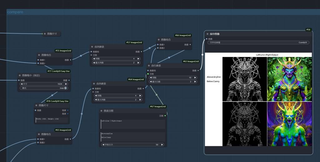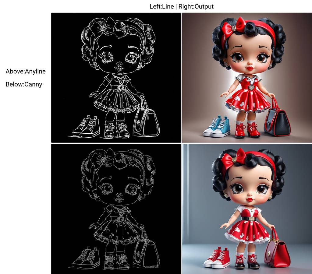 我们直接跟Canny做对比,使用相同的模型和提示词,最终输出对比图。 我们做两个对比,一个是对比Canny,分别的出图质量,一个是使用Anyline在不同contorlnet权重和降噪下,出图效果对比。