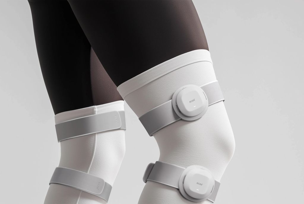 这款紧凑型追踪器用于监测和分析左右腿平衡、膝盖角度和行走模式,以辅助患者康复。该设备可通过佩戴在膝盖上方和下方的绑带来固定,让用户可以轻松地 attach 追踪器。