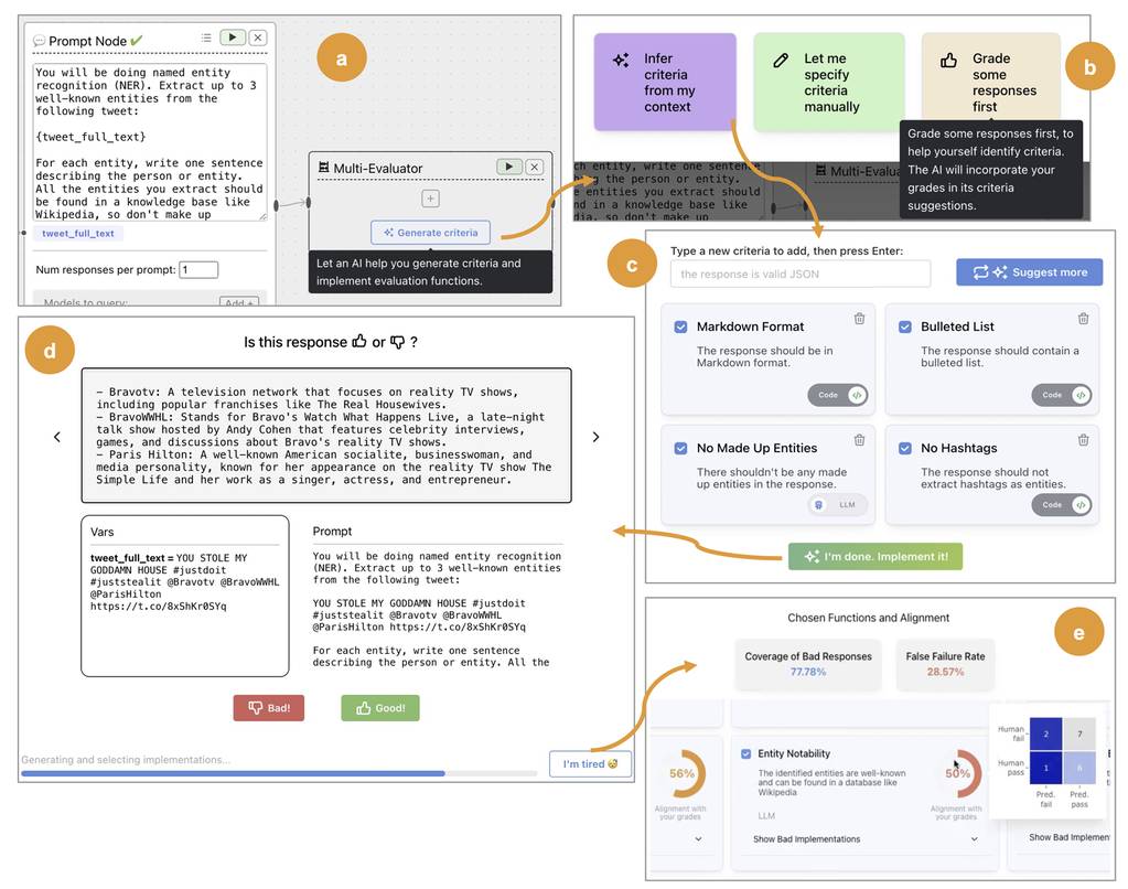 除了意外的复杂性之外,工具通常定义不明确。例如,LLM 评估工具行业正在不断发展,这些工具提供“开箱即用的 LLM 评估”,其中包含针对毒性、简洁性、语气等的通用评估器。我们已经看到许多团队在采用这些工具时,没有认真考虑其领域特定的故障模式。相比之下,EvalGen 则侧重于教授用户创建特定领域评估的过程,方法是让用户 deeply 参与到从指定标准、标记数据到检查评估的每一步中。该软件引导用户完成如下所示的工作流程: