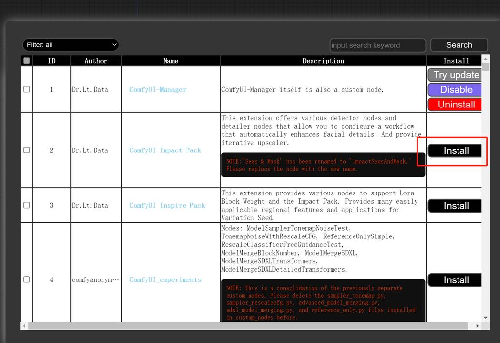 最后在弹出的界面中,搜索需要安装的插件,直接安装即可,安装后需要重启ComfyUI。