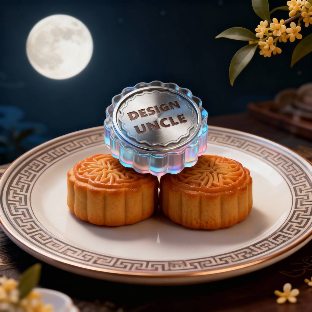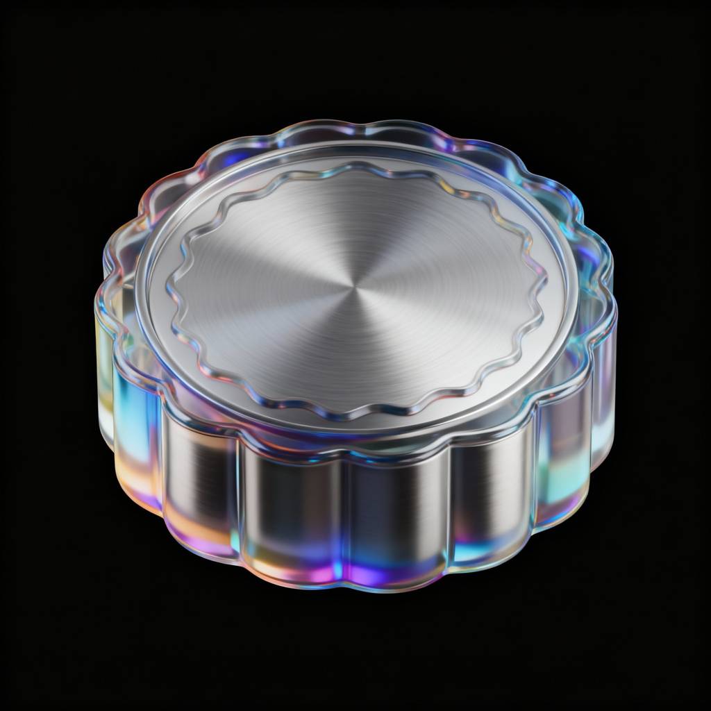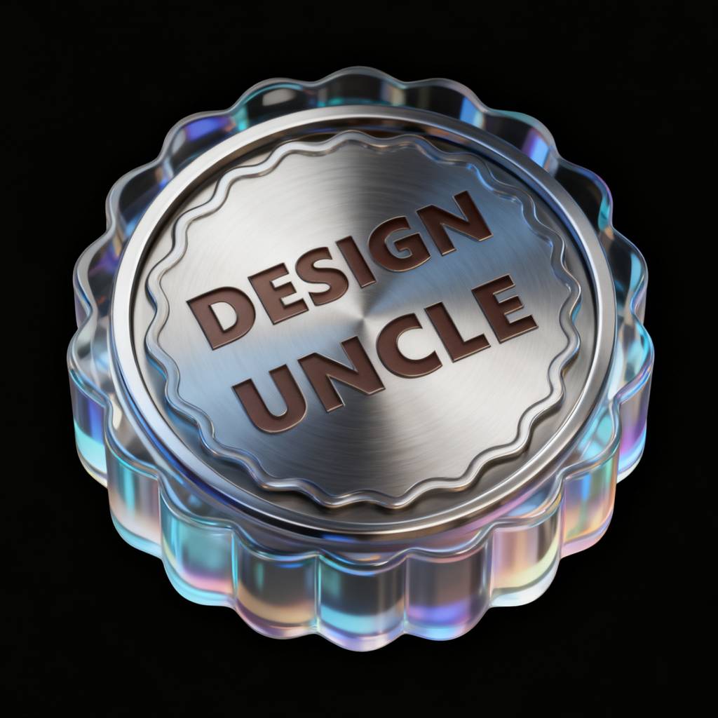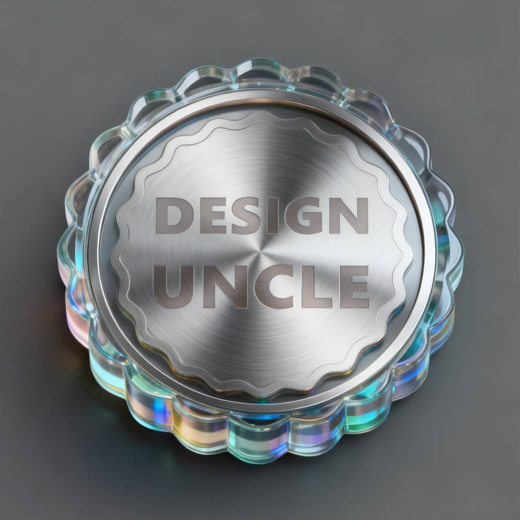 根据提供的平面图,生成一枚精致的月饼。主体为单个月饼,无其他元素干扰。外层材质为通透的渐变色散玻璃,内层为不锈钢拉丝金属质感。表面通过激光雕刻“DESIGN UNCLE”字样,字体清晰干净,与整体现代风格呼应。造型需打破传统月饼形态,呈现简约而富有设计感的立体结构。背景为纯黑色,确保画面无杂质。整体风格遵循UI与icon设计原则,采用等距视角,强调极致3D渲染效果与苹果式的设计美学。输出质量需达到16K,突出细节表现与材质真实感。