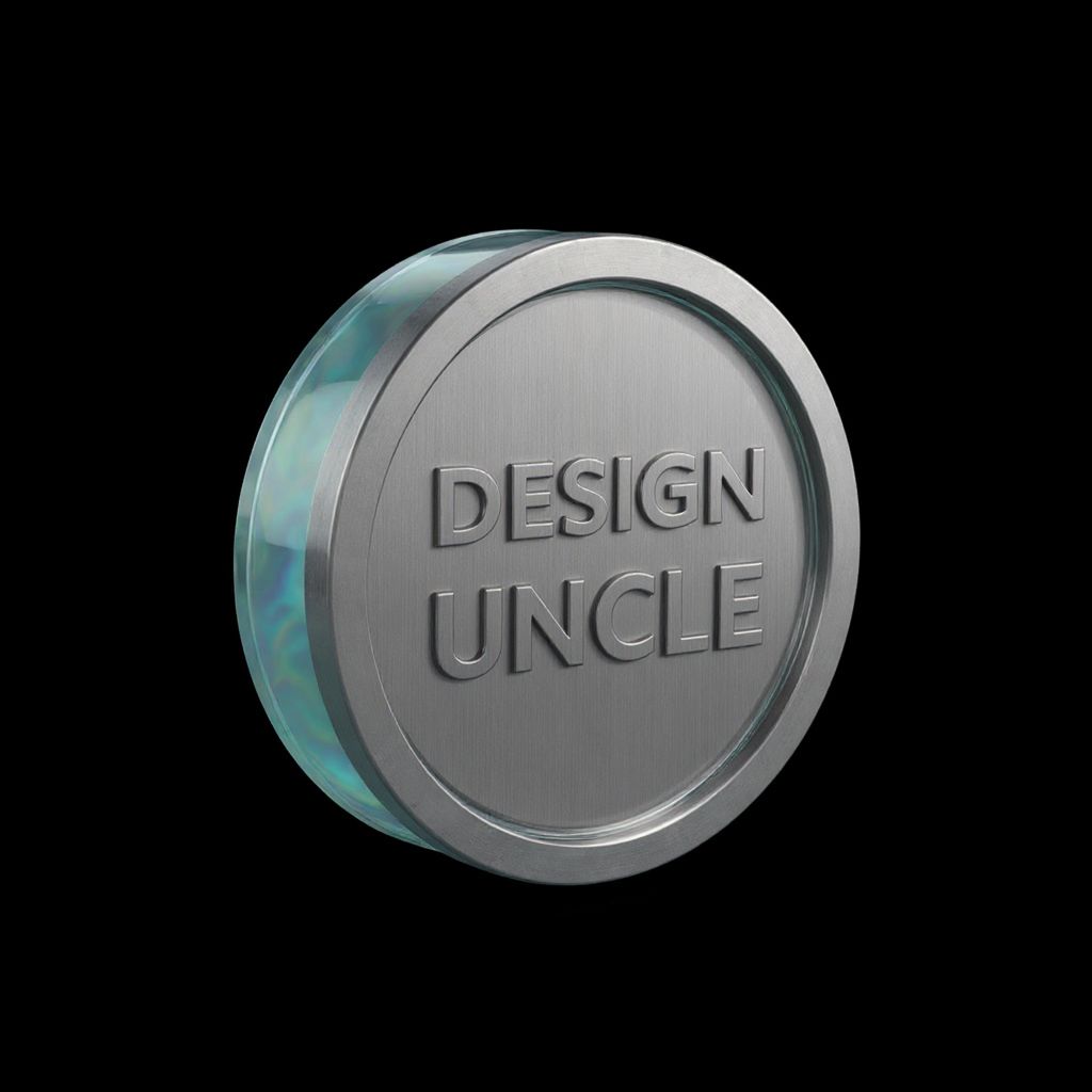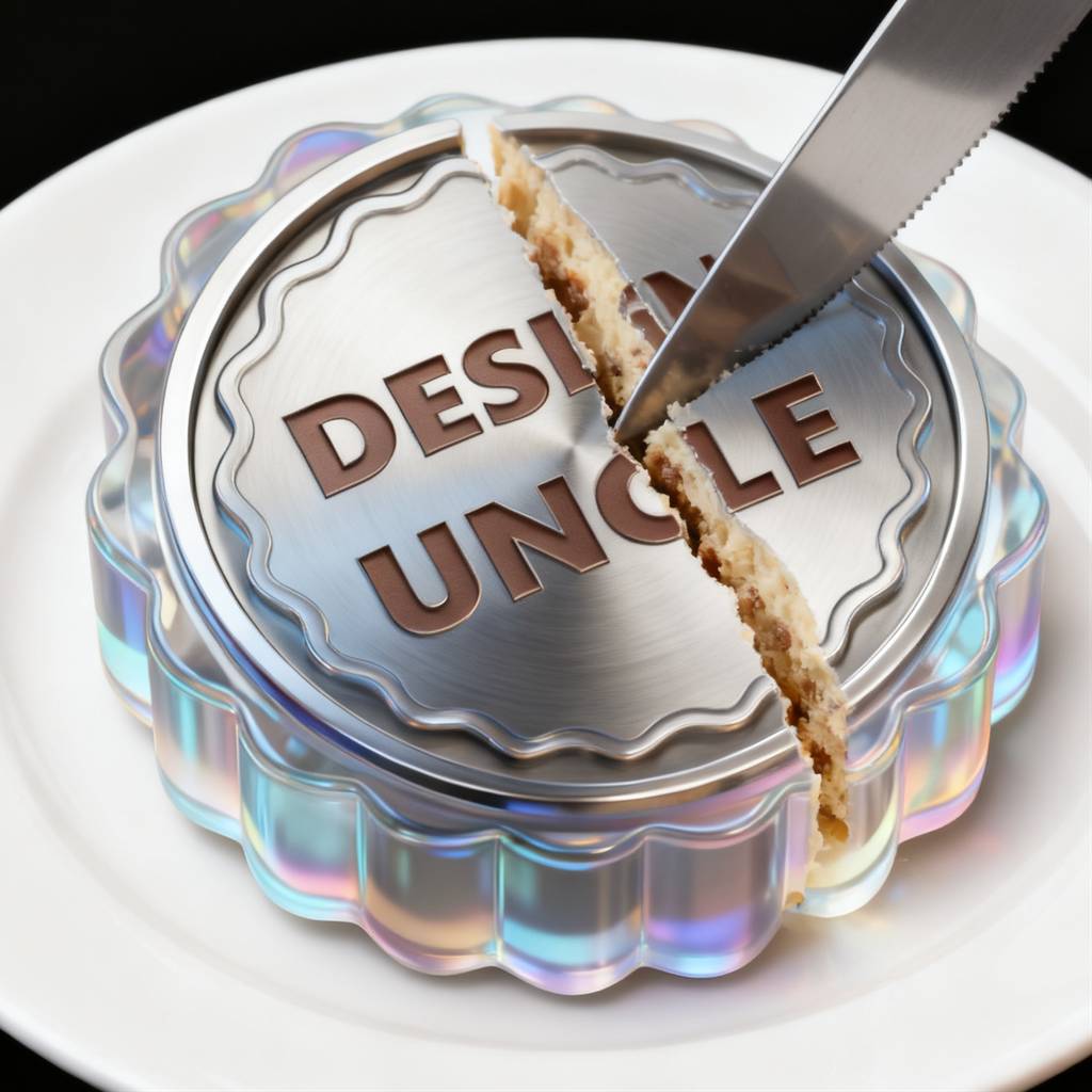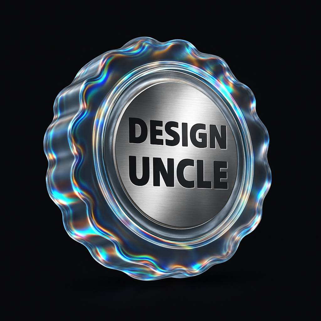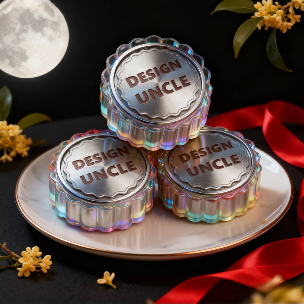 根据提供的平面图,生成一枚精致的月饼。主体为单个月饼,无其他元素干扰。外层材质为通透的渐变色散玻璃,内层为不锈钢拉丝金属质感。表面通过激光雕刻“DESIGN UNCLE”字样,字体清晰干净,与整体现代风格呼应。造型需打破传统月饼形态,呈现简约而富有设计感的立体结构。背景为纯黑色,确保画面无杂质。整体风格遵循UI与icon设计原则,采用等距视角,强调极致3D渲染效果与苹果式的设计美学。输出质量需达到16K,突出细节表现与材质真实感。