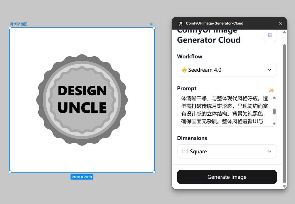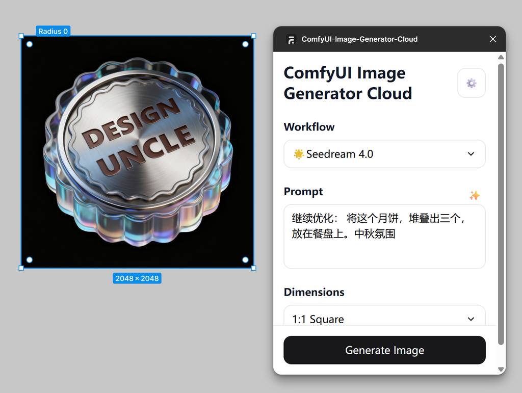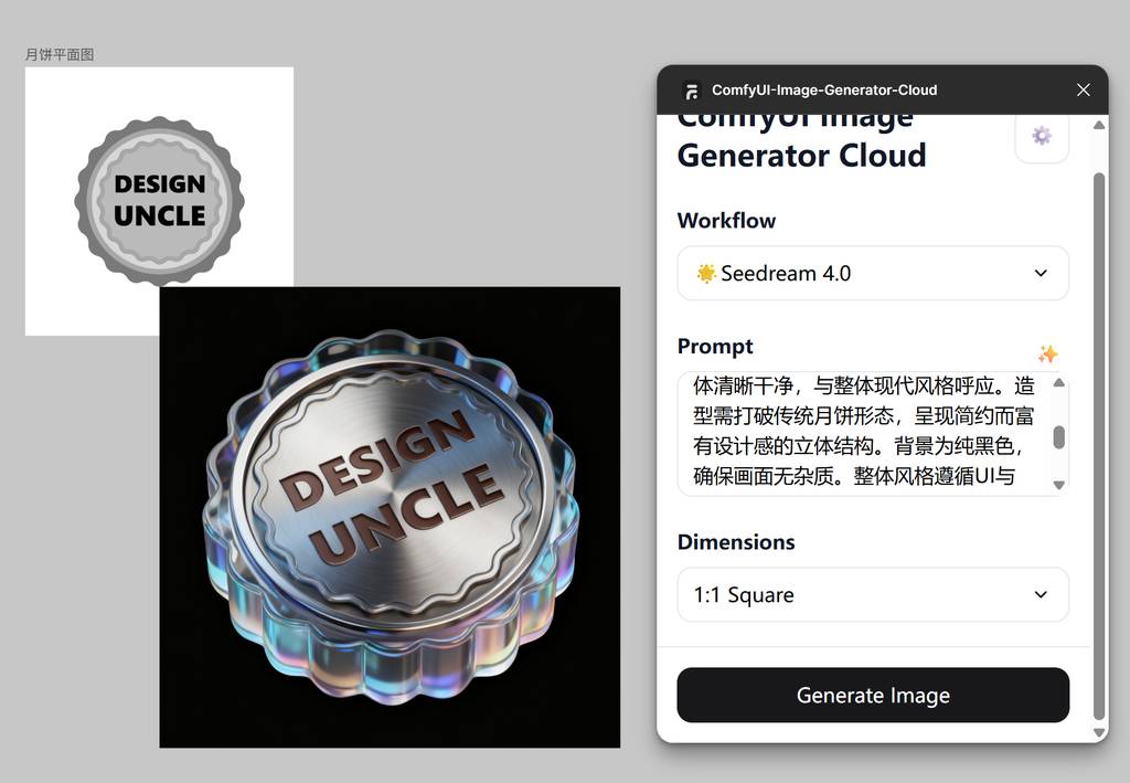 生成操作很简单,选择创建好的月饼平面图(这里注意,需要把所有元素放置到画板中)。选择 Seedream 4.0