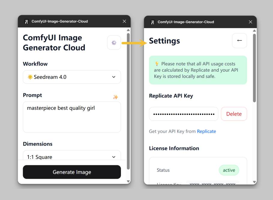 打开插件后,需要配置自己的Replicate API,AI消耗很大的算力和成本,插件本身只是一个桥梁。