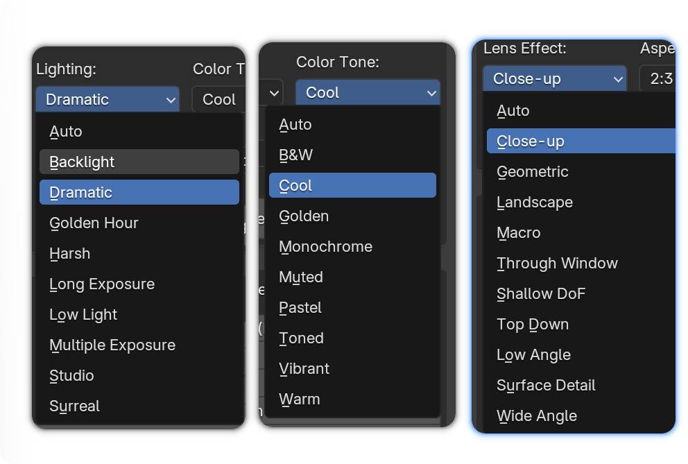 AI 生成,除了提示语优化外,提供大量的灯光、色调、镜头、比例等预设。