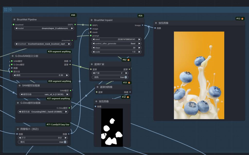 核心的模块,直接用了官方的工作流,但是加入了蒙板的拓展,使重绘的范围加大点,自然一点。