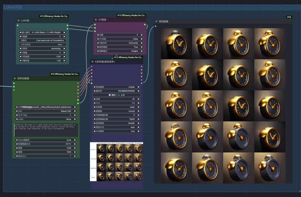 需要搭建ComfyUI工作流,生成xy图表,方便测试和评估。我们把生成的LoRA模型,复制到ComfyUI的模型目录中。然后大家工作流,进行文生图评估。