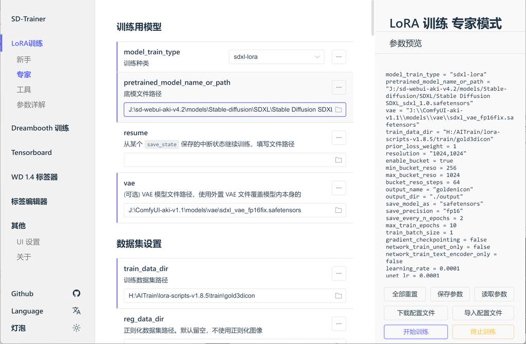 我们使用秋叶的web训练工具。为什么不用ComfyUI的训练节点呢?不知道为啥,我是跑不起来。因为秋叶大佬的训练工具也足够易用和直观,且功能齐全,所以还是觉得用秋叶大佬的工具进行训练。 训练的参数,我并非完全了解,这里只提一下我用到的几个参数。