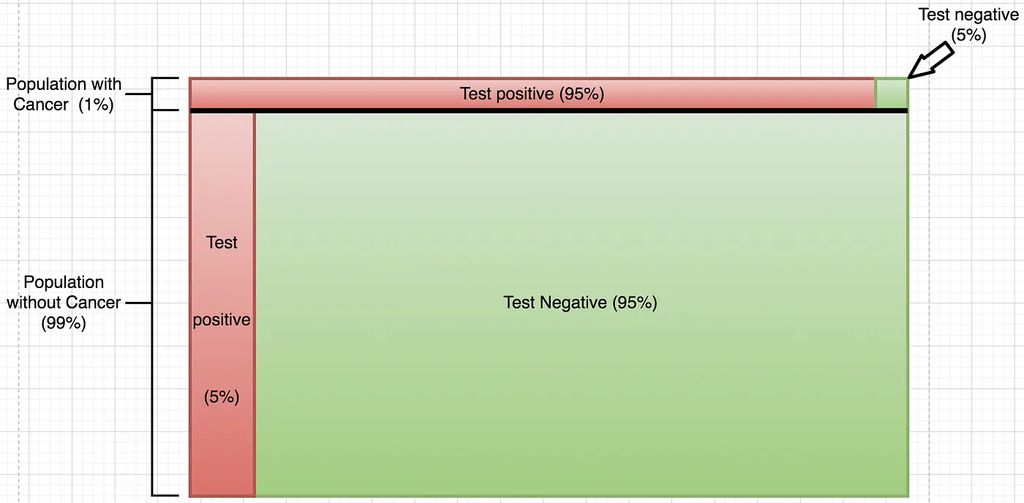 为了更具体地说明这一点,我们可以借鉴经典的医学诊断案例。假设一名患者接受了一项罕见病的检测,该检测的准确率高达99%(即真阳性率和真阴性率均为99%),而该疾病在总人口中的发病率(基础概率)仅为万分之一。当患者拿到阳性检测结果时,其直觉反应可能是自己有99%的概率患病。