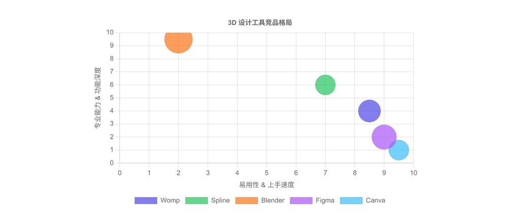 Womp在一个日益拥挤但界限分明的细分市场中运营:基于浏览器、支持协作的3D创作工具。它巧妙地将自己定位在市场的两个极端之间:一端是极其简单、面向教育的工具(如Tinkercad),另一端是功能全面、专业性极强的数字内容创作(Digital Content Creation, DCC)套件(如Blender、Maya、Cinema 4D) 9。在基于浏览器的工具领域,其最主要的直接竞争对手是Spline。