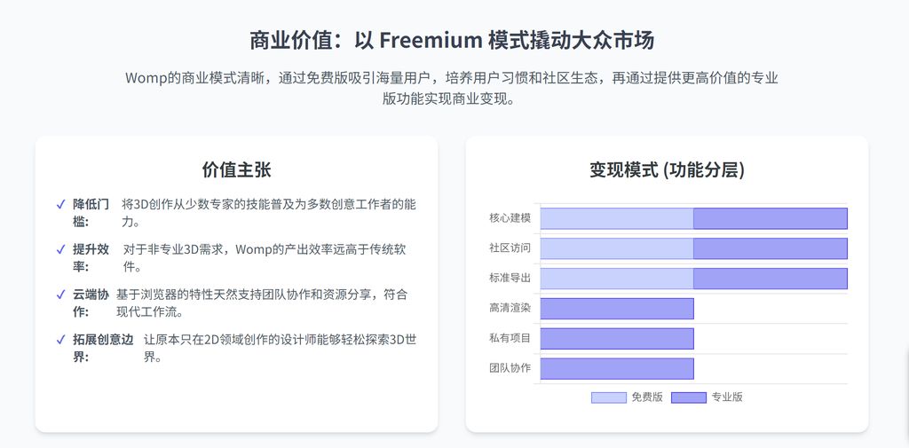 Womp从一开始就顺应了这一趋势,将其平台构建为一个云原生的、深度整合社交功能的协作体验 2。这使其在与传统的桌面软件竞争时占据了优势,并与现代化的工作流程保持一致,使其成为一个符合用户和投资者期望的、“Figma式”的3D解决方案。