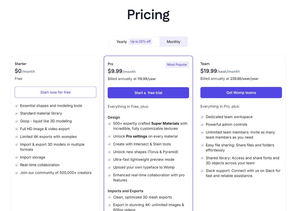 Womp采用了经典的SaaS免费增值(Freemium)商业模式,设有三个用户层级:入门版(免费)、专业版(年付12.99/月)和团队版(年付$19.99/席位/月) 1。