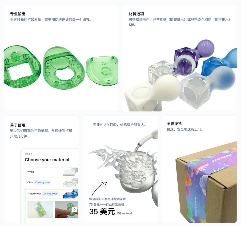 Womp提供了一项与平台无缝集成的服务,允许用户直接订购其创作的工业级质量树脂3D打印模型,并享受送货上门服务 1。这项服务不仅是一个额外的收入来源,更是其产品增长循环中的一个关键战略环节和重要的差异化优势。