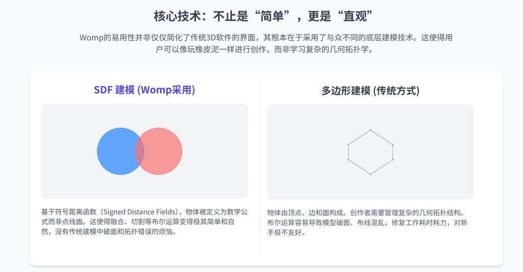 尽管SDF技术为Womp带来了无与伦比的易用性,但这项技术本身也带来了一系列深刻的局限性,这些局限性构成了Womp向专业市场扩张的最大障碍。