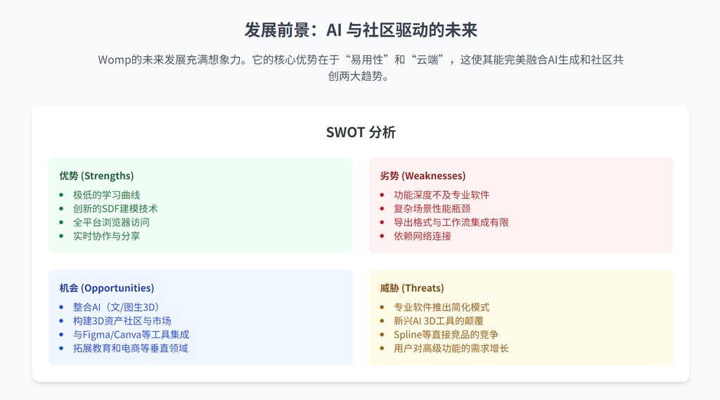 然而,Womp目前正站在一个战略的十字路口。其技术基础在当前市场中是优势,但对于进入更广阔的专业市场而言,却是一个障碍。公司的未来,将取决于其能否突破这一局限。其Primfusion AI技术的开发,不仅仅是一次增量功能的迭代,而是一次“押注公司未来”的战略转型。如果成功,这次转型可能将Womp从一个备受喜爱的利基产品,提升为一个真正的、能够影响整个行业的颠覆者。这项AI战略的执行效果,将最终决定Womp是继续作为一个令人愉快的3D入门工具,还是会成为整个创意生产流程中不可或缺的一环。