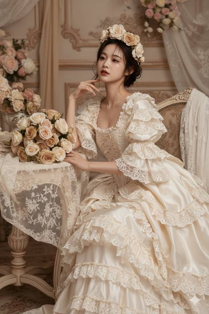 提示词完美复刻了洛可可风格的核心美学:奢华、浪漫与细腻。场景搭建上,丝绸蕾丝、花卉陈设、复古装饰,精准还原18世纪洛可可的室内氛围;造型细节(层叠礼服、蕾丝花纹、卷发+ floral头饰)抓住了风格的标志性元素,避免了“形似神不似”。技术层面,85mm镜头的中景构图、暖调低饱和色彩、哑光高光,贴合古典肖像的质感要求,“复古腮红”预设与胶片颗粒的加入,进一步强化了 timeless 的编辑感,整体思路从场景、造型到后期,形成了完整的风格闭环。