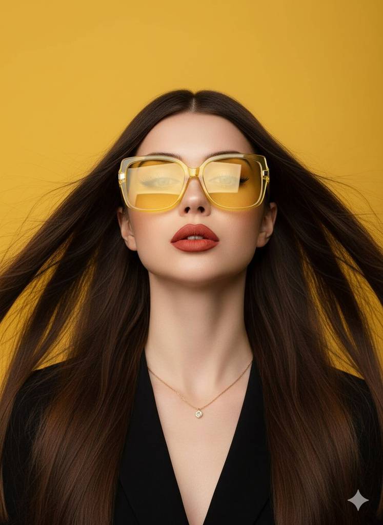 A studio portrait photograph, close-up of the mid-bust (from the chest up), with a high-fashion, glamorous, and striking aesthetic. The female figure is positioned frontally, with her head tilted slightly back and her chin raised, looking straight ahead with a serious, confident, and seductive expression. Her lips are half-parted, adding a touch of mystery and sensuality. The composition is clean, dramatic, and focuses intensely on the face and glasses, with the hair flowing dynamically. The female figure appears to have a slender build, as evidenced by the visible neckline and décolleté. Due to the framing and clothing, it is impossible to determine the size of her breasts, the narrowness of her waist, the width of her hips, the thickness of her legs, or the size of her buttocks. The skin on her face and décolleté is smooth and flawless, with a soft tan tone and a finish that subtly reflects the light. The standout element is her sunglasses: a large, stylish, and modern pair with bright yellow frames and yellow or light orange lenses, adding a fashion-forward touch. The glasses cover much of her eyes, but her eyebrows and eyeliner are visible behind them. She wears a dark garment, possibly a blouse or blazer, with a soft V-neckline that reveals a bit of her cleavage and part of a thin necklace with a small gold or silver pendant. The contrast between the black of the outfit and the vibrant colors of the background and the glasses is very effective. Her hair is long, very straight, and black or very dark brown. The strands are shiny, healthy, and appear to be in motion, flowing slightly up and to the sides, as if blown by a gentle breeze or a studio fan, adding dynamism and drama to the image. It frames her face and falls over her shoulders and chest. The makeup is sophisticated and polished: the eyebrows are dark, full, and perfectly arched, creating a strong line above the glasses. The eyes are dramatically highlighted with precise black eyeliner and long, voluminous lashes. High resolution, cinematic lighting, soft background blur, high contrast, vibrant color grading.