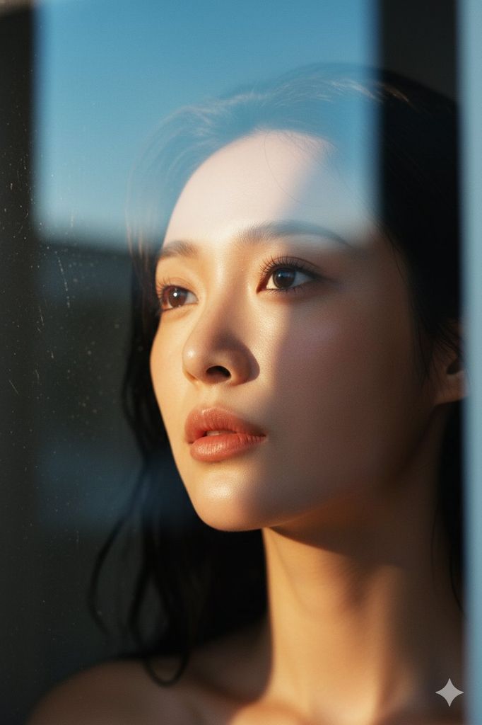 该提示词精准运用了** chiaroscuro(明暗对比)摄影手法**,是营造戏剧感的经典思路。极近景构图聚焦面部细节,玻璃反射的设定增加了画面的叙事性与层次感,天空倒影的细节让场景更真实。光线设计是核心:侧方硬光形成强烈明暗分割,暖调(黄金时刻)与阴影冷蓝的对比,强化了情绪张力;长焦/微距镜头与大光圈的组合,确保面部纹理、毛孔的清晰呈现,符合高质感特写的创作要求,整体从构图、光线到细节,完全遵循戏剧化肖像的拍摄逻辑。