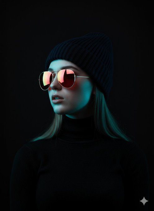 A hyper-realistic, low-angle portrait of a young woman, appearing to be in her early twenties, with the exact facial features, hairstyle, and hair color from the reference image. She is looking upwards, wearing a dark beanie and a fitted black turtleneck, with bright red reflective sunglasses. The subject is dramatically lit by strong, high-contrast blue and cyan lighting from below, casting deep shadows against a pure black background. Captured with an 85mm f/1.4 high-end cinematic lens, ensuring full sharp detail, rich texture, natural skin texture, soft background blur, and precise color transitions, maintaining 100% fidelity to the reference woman’s facial features and style. Negative: blurry, low-res, extra limbs, bad anatomy, watermark, text.