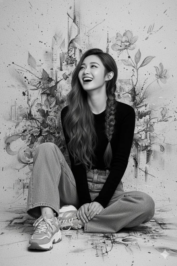 这是生活化艺术肖像的创作典范,核心在于“自然感与形式感的平衡”。提示词保留人物核心特征(面部、发型),仅优化造型与背景,符合AI二次创作的实用场景;黑白单色风格聚焦光影与情绪,避免色彩分散注意力。人物姿态(优雅坐地、仰头大笑)充满生活气息,半编发与休闲穿搭的组合,让肖像更具亲和力;整体构图强调“艺术感”而非“摆拍感”,黑白调性则赋予日常场景更高的审美高度,是将生活化场景转化为艺术肖像的优质思路。