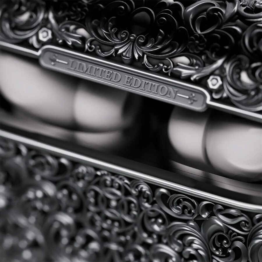 在追求艺术性的同时,这款设计也保留了实用性,符合人体工程学的耳塞依然易于清洁和使用。然而,真正令人着迷的,是它那精雕细琢的外观。从耳机盒与盒盖连接处的“限量版”字样,到标记每一件独特作品的序列号,每一个元素都经过精心考量。甚至在正面还设计了一个旋转锁扣,为这款高科技耳机盒增添了一丝古典的韵味。