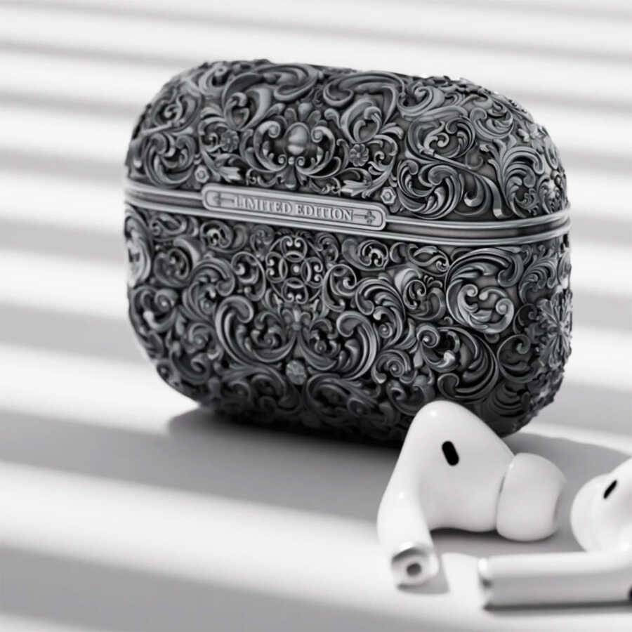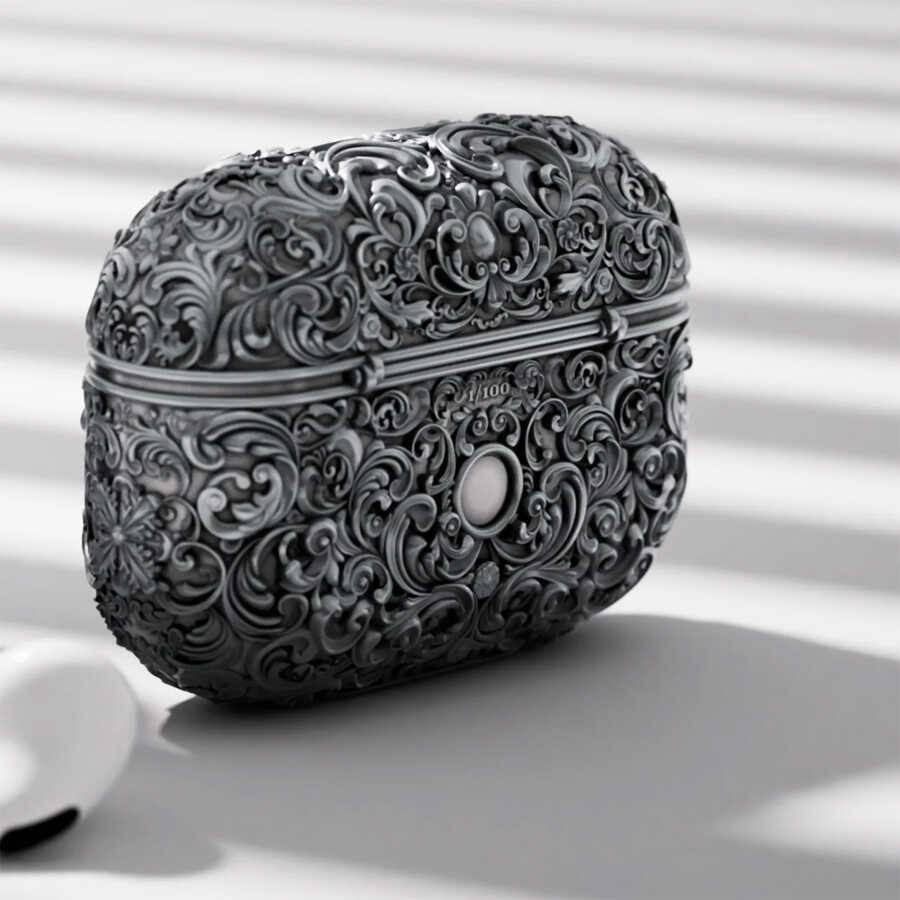 Mohammed 的设计理念与当下潮流背道而驰,他深入探寻了 17 世纪的富丽堂皇,那个时代,艺术与建筑都充满了繁复的细节和令人叹为观止的宏伟气势,而这些在现代产品中却难得一见。“The Case”不仅仅是一个配件,它更像是将历史的片段重新演绎,并融入到现代科技之中。精美的花卉雕刻和氧化银的表面处理,使其超越了单纯的实用功能,化身为一件精美的艺术品,将取出 AirPods 的简单动作,升华为一场微型杰作的鉴赏。这也引发了我们思考:日常使用的科技产品能否成为当代艺术家挥洒创意的新画布?