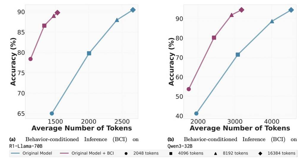 在MATH数学数据集(包含代数、微积分、概率等复杂题型)的测试中,采用“行为条件推理”的模型,与传统模型达到相同准确率时,token消耗减少46% 。这一数据直观揭示了当前AI推理的“冗余成本”——我们此前在不知不觉中,为模型的“重复推导”浪费了近一半的计算资源。
