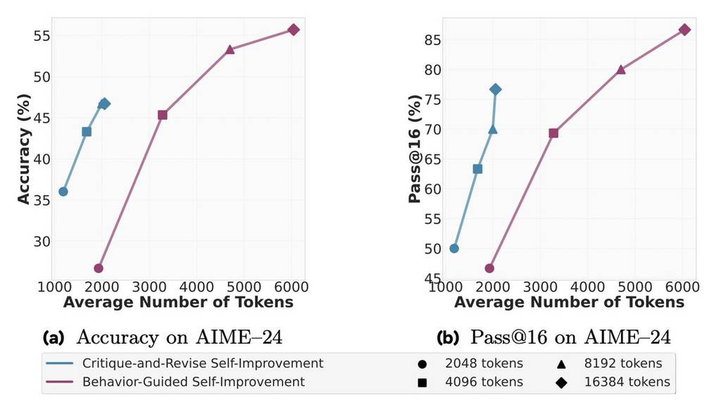 这一方案的效果远超现有方法:在MATH数学数据集上,保持推理准确率不变的前提下,token消耗减少46%;在AIME(美国数学邀请赛)任务中,通过“行为引导自优化”策略,相比传统“批判-修正”模式,准确率提升10%。更关键的突破在于——对模型进行“行为条件推理”微调后,小模型不仅速度更快,还具备了更优的推理能力。“行为”就像搭建复杂推理能力的“脚手架”,让模型的推理逻辑更系统、更高效。
